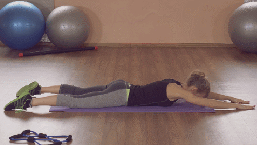 매트에 배를 대고 엎드리세요. 그리고 다리는 충분히 벌려서 바닥에 붙입니다. 그런 다음 팔을 앞으로 쭉 뻗습니다. 이번에는 상체를 천천히 들어서 버텼다가 원래 자세로 돌아오세요. 1분 동안 상체를 드는 동작을 반복합니다.
