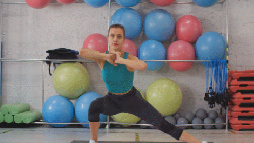 바닥에 서서 다리는 넓게 벌려줍니다. 그리고 왼쪽 무릎을 구부리면서 상체를 왼쪽으로 이동했다가 돌아옵니다. 그런 다음 오른쪽 무릎을 구부리면서 상체를 오른쪽으로 이동했다가 돌아옵니다. 사이드 런지 동작을 1분간 진행하세요.