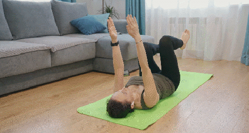 매트에 등을 대고 눕고, 팔은 공중으로 뻗으세요. 다리는 들어서 무릎을 90도로 구부립니다. 그리고 왼발을 앞으로 뻗으면서 오른손을 뒤로 뻗으세요. 원래 자세로 돌아오면, 오른발을 앞으로 뻗는 동시에 왼손을 뒤로 뻗습니다. 1분 동안 움직입니다.