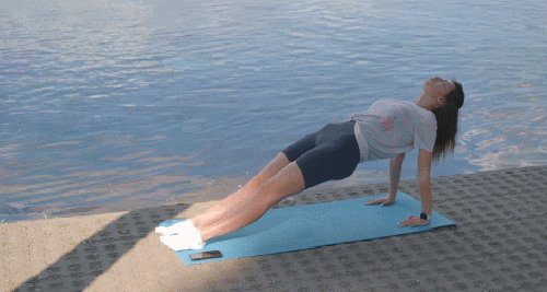 매트에 누운 상태로 호흡을 정리합니다. 손을 바닥에 짚으면서 몸을 공중으로 띄우세요. 어깨에서 발끝까지 라인을 사선으로 유지합니다. 복부와 엉덩이에 힘을 주고, 곧게 뻗은 상태를 만드세요. 1분 동안 최대한 버티는 동작을 진행합니다.