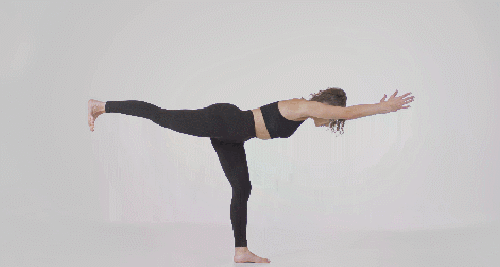 매트에 다리를 모으고 서서 준비하세요. 그리고 오른쪽 다리를 뒤로 뻗으면서 상체를 앞으로 숙입니다. 이때 팔을 앞으로 뻗어서 몸 전체를 T자 모양으로 만듭니다. 30초 운동 후, 반대편 다리로 반복하면서 30초 운동합니다.