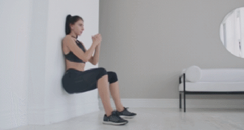 벽 앞에 서서 준비하세요. 그리고 등을 벽에 기대고, 손을 가슴 앞에서 잡습니다. 그런 다음 무릎을 구부리면서 엉덩이를 낮추고, 스쿼트 자세를 만드세요. 엉덩이를 최대한 낮춘 후, 자세를 유지하고 버팁니다. 시선은 정면을 보고, 1분간 운동합니다.