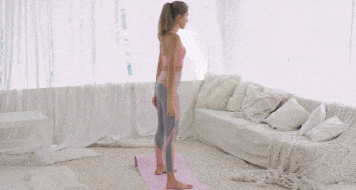 매트에 서서 어깨너비보다 다리를 넓게 벌립니다. 무릎을 구부리면서 엉덩이를 바닥으로 내리세요. 손은 가슴 앞에서 모았다가 일어서면서 내려줍니다. 시선은 정면을 바라봅니다. 상체는 구부정하지 않도록 주의하세요. 1분 동안 진행합니다.