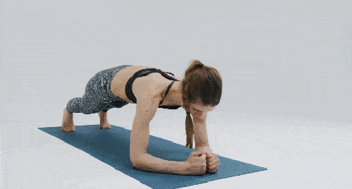 매트에 엎드려서 팔꿈치 플랭크 자세로 시작합니다. 왼쪽 팔꿈치를 펴고, 오른쪽 팔꿈치를 펴서 플랭크 기본자세로 연결하세요. 왼쪽 팔꿈치를 구부리고, 오른쪽 팔꿈치를 구부려서 원래 자세로 돌아옵니다. 1분 동안 업다운 동작을 진행하세요.