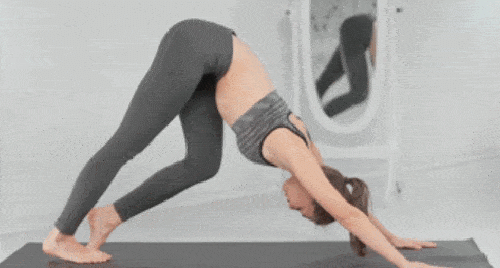 매트에 엎드린 상태에서 준비하세요. 엉덩이를 공중으로 높이 들고, 다운도그 자세를 만듭니다. 왼쪽 발꿈치를 들었다가 내리고, 오른쪽 발꿈치를 들었다가 내리세요. 발꿈치를 번갈아 움직이면서 1분 동안 자세를 유지합니다. 팔꿈치는 완전히 펴주세요.
