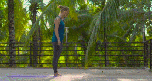 매트에 발을 모으고 서서 준비합니다. 상체를 앞으로 숙이세요. 손을 바닥에 짚고, 호흡을 유지하면서 버팁니다. 자신의 신체 상태에 따라 내릴 수 있는 위치까지만 운동을 진행하세요. 무릎은 최대한 펴줍니다. 1분 동안 상체를 숙이는 동작을 진행하세요.