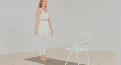 의자 앞에 몇 걸음 떨어진 위치에 서서 시작합니다. 상체를 앞으로 천천히 숙이면서 팔을 뻗어주세요. 손으로 의자를 잡고, 스트레칭을 진행합니다. 가슴을 바닥으로 내린다는 느낌으로 운동하세요. 1분 동안 진행합니다. 다리를 공중으로 드는 동작을 추가할 수 있습니다.
