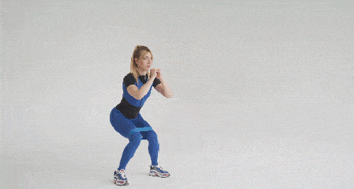 매트에 서서 다리 사이에는 밴드를 착용합니다. 손은 가슴 앞에서 모아주세요. 무릎을 구부리면서 스쿼트 자세를 잡습니다. 자세를 유지하면서 다리를 벌렸다가 오므리는 동작을 추가하세요. 시선은 정면을 응시합니다. 1분 동안 반복하세요.