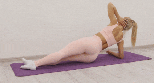 오른쪽 팔뚝을 매트에 대고 옆으로 누워서 시작하세요. 왼손은 머리 옆으로 가져갑니다. 엉덩이를 들어서 사이드 팔꿈치 플랭크 자세를 만드세요. 엉덩이를 내렸다가 들면서 30초 동안 운동합니다. 자세를 반대편으로 바꿔서 동일하게 30초 동안 운동하세요.