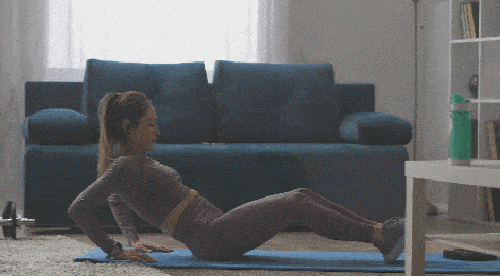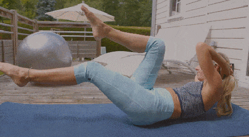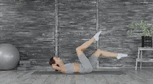 매트에 누운 상태로 손을 머리 옆으로 옮깁니다. 다리를 공중으로 올리세요. 오른쪽 무릎을 당기면서 상체를 일으키면서 틀어줍니다. 왼쪽 무릎을 당기면서 상체를 틀어주세요. 무릎을 번갈아 당겨주면서 반복합니다. 1분 동안 진행하세요.