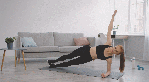 오른쪽 팔뚝을 매트에 대고 옆으로 누워서 시작하세요. 엉덩이를 들어서 사이드 팔꿈치 플랭크 자세를 만듭니다. 오른손은 공중으로 뻗어주세요. 시선은 정면을 응시합니다. 30초 운동하세요. 반대편으로 돌아서 눕고, 30초 동안 반복하세요.