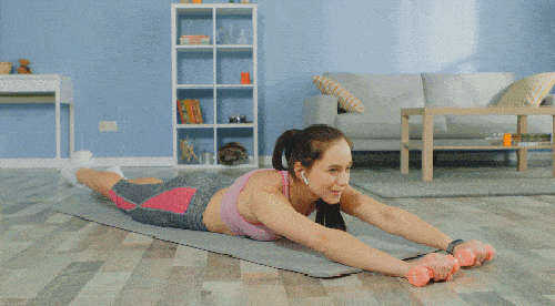 배를 매트에 대고 엎드리세요. 왼손을 들면서 오른발을 들었다가 내립니다. 이번에는 오른손을 들면서 왼발을 들었다가 내립니다. 손과 발을 번갈아 움직이세요. 손에 아령을 들면, 운동 효과를 높일 수 있습니다. 1분 동안 진행하세요.