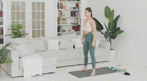 다리를 벌리고 매트에 서서 시작합니다. 무릎을 구부리면서 엉덩이를 낮추세요. 스쿼트 동작을 진행한 후, 원래 자세로 돌아옵니다. 팔은 엉덩이를 낮추면서 가슴 앞으로 당겼다가 일어서면서 옆구리로 가져갑니다. 1분간 운동하세요.