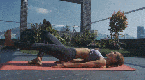매트에 누운 상태로 무릎을 당겨서 세웁니다. 엉덩이를 들면서 왼쪽 다리는 앞으로 뻗으세요. 다리를 든 상태를 유지하고 업다운 동작을 진행합니다. 30초 운동하세요. 이번에는 오른쪽 다리를 앞으로 뻗습니다. 30초 동안 업다운 동작을 반복하세요.