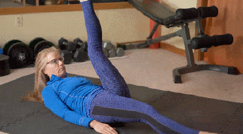 매트에 누운 상태에서 손을 머리 뒤로 보냅니다. 무릎을 당겨서 세우고, 발은 바닥에 붙입니다. 왼쪽 무릎을 당기면서 상체를 틀어서 일으키세요. 오른쪽 무릎을 당기면서 상체를 틀어서 일으킵니다. 1분 동안 반복하세요.
