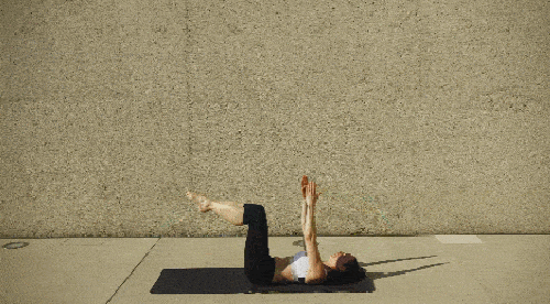 매트에 등을 대고 눕습니다. 손은 골반 아래로 이동하세요. 다리는 공중으로 뻗어줍니다. 무릎을 펴주고, 발끝은 뻗어줍니다. 다리를 바닥으로 내리면서 다시 들어주세요. 이때 무릎을 구부렸다가 당기면서 펴줍니다. 1분 동안 반복하세요.