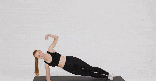 매트에 오른쪽 팔뚝을 대고 옆으로 누워서 시작하세요. 엉덩이를 들어서 사이드 팔꿈치 플랭크 자세를 만들고, 왼손은 공중으로 뻗습니다. 왼손을 바닥으로 내리면서 몸을 틀어주세요. 30초 운동 후, 반대편 자세로 돌아서 눕고, 30초 운동합니다.
