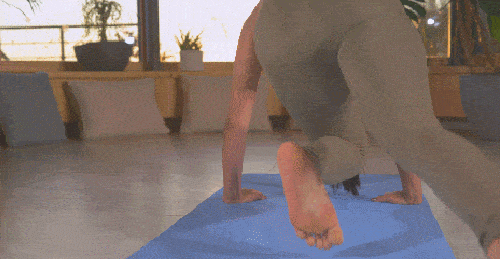 매트에 플랭크 자세로 엎드리세요. 왼손을 들어서 오른쪽 어깨를 터치하고 돌아옵니다. 이번에는 오른손을 들어서 왼쪽 어깨를 터치하고 돌아옵니다. 플랭크 자세를 유지하면서 손을 번갈아 움직이세요. 1분 동안 운동합니다.