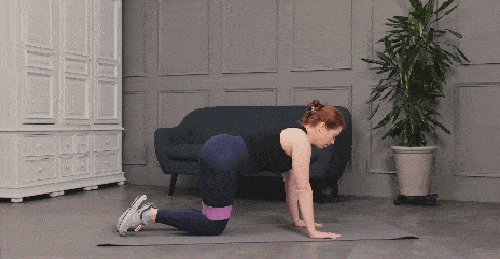 매트에 네발기기 자세로 엎드립니다. 허벅지 사이에는 밴드를 착용하세요. 오른쪽 다리를 공중으로 들어줍니다. 이때 왼팔을 앞으로 뻗어주세요. 천천히 원래 자세로 돌아옵니다. 30초 동안 진행하세요. 왼쪽 다리를 들고, 오른팔을 뻗는 동작으로 30초 반복합니다.