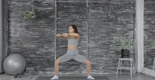 다리는 최대한 넓게 벌린 상태에서 매트에 서서 준비합니다. 손은 가슴 앞으로 모아서 잡습니다. 무릎을 구부리면서 스쿼트 동작을 시작하세요. 시선은 정면을 응시합니다. 1분 동안 와이드 스쿼트 동작을 진행하세요.