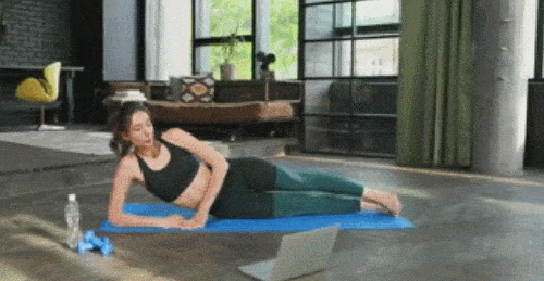 매트에 누운 상태에서 무릎을 세웁니다. 왼쪽 다리를 오른쪽 다리에 걸치세요. 엉덩이를 들었다가 내리는 동작을 30초 진행합니다. 이번에는 오른쪽 다리를 왼쪽 다리 위에 걸치고, 30초 반복합니다.