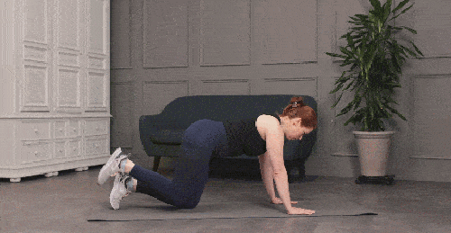 매트에 엎드려서 네발기기 자세를 만듭니다. 오른쪽 다리를 공중으로 뻗어주세요. 무릎은 구부린 상태를 만듭니다. 다리를 내렸다가 들면서 30초 동안 운동하세요. 왼쪽 다리를 공중으로 뻗고 동일하게 반복합니다. 30초 운동하세요.