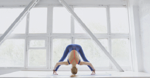 다리를 최대한 넓게 벌린 상태로 매트에 서서 시작합니다. 상체를 앞으로 숙이면서 손으로 바닥을 짚거나 발목을 잡아주면 되는데요. 유연성이 부족하면, 무릎을 구부리거나 다리 범위를 좁히세요. 1분간 운동합니다.