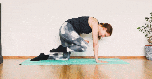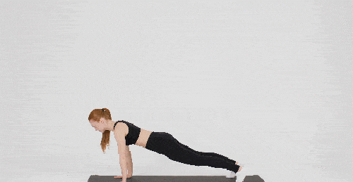 매트에 플랭크 기본자세로 엎드리세요. 엉덩이를 들면서 상체를 내리고 다운도그 자세를 만듭니다. 이때 왼손을 당겨서 오른발로 뻗어줍니다. 원래 자세로 돌아가세요. 이번에는 다운도그 자세를 만들면서 오른손을 당겨서 왼발로 뻗으세요. 1분간 진행합니다.