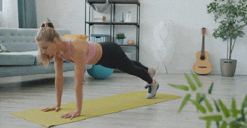 플랭크 기본자세로 매트에 엎드려서 시작하세요. 왼발을 공중으로 들었다가 내리고, 오른발을 공중으로 들었다가 내리세요. 1분 동안 반복합니다. 팔꿈치는 완전히 편 상태를 유지하고, 시선은 바닥을 응시합니다.