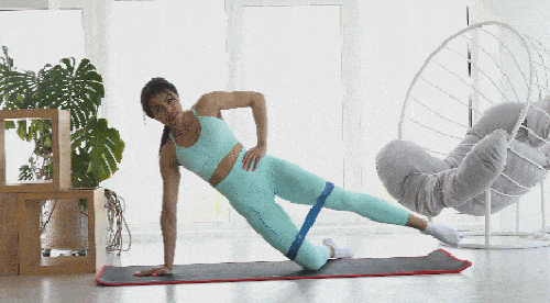 매트에 오른손을 대고 옆으로 눕습니다. 허벅지 사이에는 밴드를 착용하여 운동 효과를 높이세요. 왼손은 옆구리로 가져갑니다. 왼쪽 다리를 공중으로 들었다가 내리면서 운동하세요. 30초 진행합니다. 자세를 바꿔서 오른쪽 다리를 드는 동작으로 30초 반복하세요.