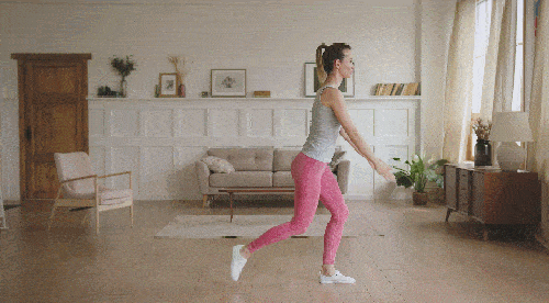 바닥에 서서 준비하세요. 왼쪽 다리를 뒤로 보내면서 오른쪽 무릎을 구부립니다. 팔꿈치를 구부려서 손을 모아줍니다. 원래 자세로 돌아옵니다. 오른쪽 다리를 뒤로 보내면서 왼쪽 무릎을 구부리는 동작으로 반복합니다. 1분 동안 진행하세요.