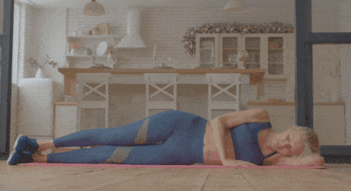 왼쪽 측면을 옆으로 대고 누워서 시작합니다. 오른손으로 바닥을 지탱하세요. 오른쪽 다리를 공중으로 들었다가 내리면서 30초 동안 운동합니다. 이번에는 자세를 바꿔서 반대편으로 눕습니다. 왼쪽 다리를 들었다가 내리면서 30초 운동하세요. 밴드를 활용하면, 운동 효과를 높일 수 있습니다.