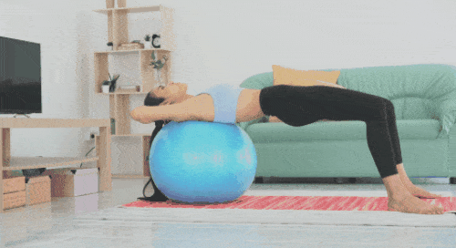 짐볼이나 소파에 등을 대고 눕습니다. 손은 머리 뒤로 보내서 잡거나 복부 위에 올립니다. 엉덩이를 들어서 어깨와 무릎 라인을 직선으로 맞췄다가 원래 자세로 돌아갑니다. 1분 동안 엉덩이를 드는 동작을 반복하세요.