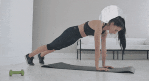 매트에 플랭크 자세로 엎드리세요. 오른손을 들어서 왼쪽 어깨를 터치하고 돌아옵니다. 이번에는 왼손을 들어서 오른쪽 어깨를 터치하고 돌아옵니다. 플랭크 자세를 유지하면서 손을 번갈아 움직이세요. 1분 동안 운동합니다.