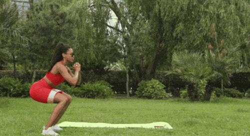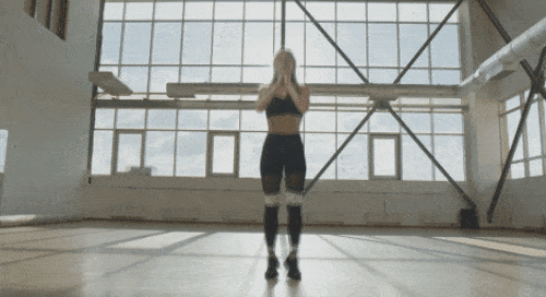 바닥에 서서 발을 모으고 준비합니다. 손은 가슴 앞에서 모아서 잡아줍니다. 점프 동작과 함께 발을 넓게 벌리세요. 자세를 낮추면서 스쿼트 동작을 진행합니다. 일어서면서 점프 동작과 함께 발을 모아주세요. 다시 점프와 함께 발을 벌리고 스쿼트 동작으로 연결합니다. 1분간 운동하세요.