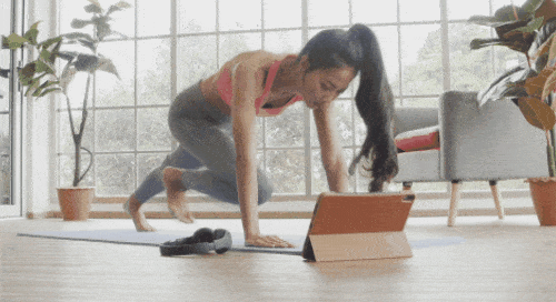 매트에 플랭크 기본자세로 엎드리세요. 오른쪽 무릎을 당겼다가 되돌리면서 왼쪽 무릎을 당겨줍니다. 무릎을 번갈아 빠르게 당겨주면 되는데요. 팔꿈치는 펴주고, 시선은 바닥을 바라봅니다. 1분 동안 진행하세요.