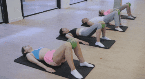 매트에 누운 상태에서 무릎을 세우고, 발은 바닥에 고정합니다. 팔을 바닥으로 누르면서 몸을 공중으로 띄우세요. 몸을 사선으로 만들고 천천히 바닥으로 내립니다. 다시 엉덩이를 들었다가 내리는 동작을 진행하세요. 1분간 운동합니다. 다리 사이에 볼이나 수건을 끼우면, 운동 효과를 높일 수 있습니다.