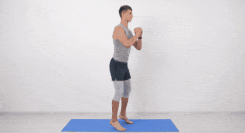 어깨너비보다 넓게 다리를 벌리고 서서 준비하세요. 엉덩이를 최대한 바닥으로 내렸다가 돌아옵니다. 이때 발꿈치를 들어서 운동 효과를 높이세요. 스쿼트 동작을 반복합니다. 손은 가슴 앞에서 모아서 잡고, 시선은 정면을 향합니다. 1분간 운동하세요.