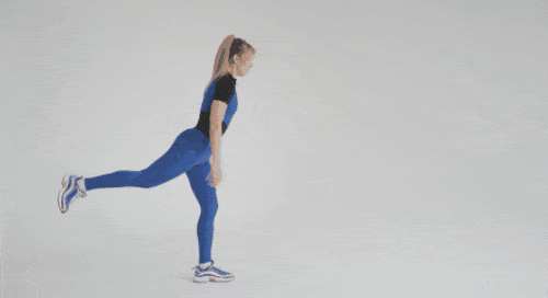 바닥에 서서 시작합니다. 오른쪽 다리를 뒤로 뻗고, 무릎을 구부리세요. 런지 동작을 진행합니다. 일어서면서 오른발을 뒤로 뻗는 동작으로 연결하세요. 30초 반복합니다. 이번에는 왼쪽 다리를 뒤로 뻗고 런지 동작을 진행하세요. 킥백 동작으로 연결합니다. 30초 운동하세요.