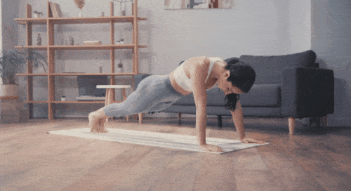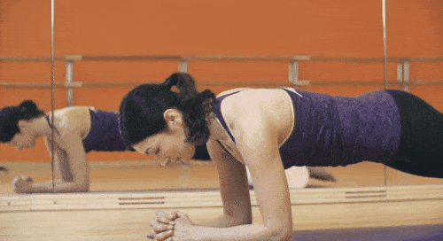팔꿈치 플랭크 자세에서 시작합니다. 엉덩이를 들어서 돌고래 플랭크 자세로 연결하는 동작을 반복하면 되는데요. 팔뚝으로 몸을 지탱하고, 균형이 무너지지 않도록 자세를 유지합니다. 1분 동안 2가지 동작을 반복하고, 시선은 바닥을 응시하세요.