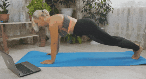 매트에 플랭크 자세로 엎드려서 준비합니다. 왼쪽 팔꿈치를 구부리고, 오른쪽 팔꿈치를 구부립니다. 팔뚝으로 몸을 지탱하는 팔꿈치 플랭크 자세를 만듭니다. 팔꿈치를 차례로 펴고 원래 자세로 돌아옵니다. 1분 동안 업다운 동작을 이어가세요.
