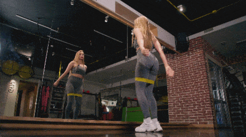 매트에 서서 어깨너비보다 다리를 넓게 벌리세요. 다리 사이에는 밴드를 착용하여 운동 효과를 높입니다. 스쿼트 동작을 진행하고 원래 자세로 돌아오세요. 이때 한쪽 다리를 뻗으면서 발꿈치를 들어주세요. 이번에는 스쿼트 후, 반대편 다리로 반복합니다. 1분간 진행하세요.