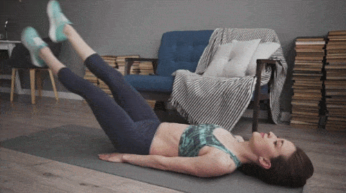 매트에 등을 대고 누워서 손을 골반 아래로 보냅니다. 다리를 공중으로 띄우세요. 다리를 벌렸다가 오므리면서 교차하는 동작을 반복합니다. 복부에 힘을 주면서 바닥으로 누르세요. 허리가 뜨지 않도록 합니다. 1분 동안 운동하세요.