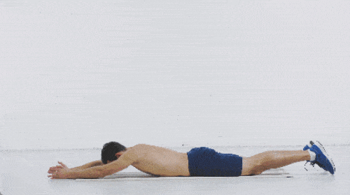 매트에 배를 대고 엎드려서 준비합니다. 팔은 앞으로 뻗으세요. 상체와 하체를 동시에 공중으로 들어올립니다. 이때 손끝과 발끝을 최대한 뻗어주면 되는데요. 몸을 늘여준다는 느낌으로 진행합니다. 시선은 바닥을 응시하세요. 1분 동안 진행합니다.