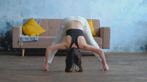 매트에 서서 다리를 최대한 넓게 벌립니다. 상체를 앞으로 숙이세요. 손으로 바닥을 짚거나 발가락을 잡아주세요. 신체 상태에 따라 발목을 잡거나 팔뚝을 바닥에 대는 자세를 진행할 수 있는데요. 1분 동안 호흡하면서 운동합니다.