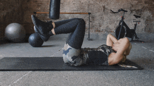 매트에 누운 상태로 손을 머리 뒤로 보내서 잡습니다. 다리는 공중으로 들고, 무릎을 90도 각도로 구부리세요. 발은 교차하여 줍니다. 상체를 일으켰다가 내리는 크런치 동작을 반복하세요. 1분 동안 천천히 운동합니다.