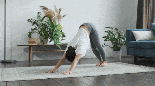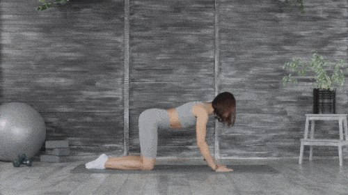 매트에 엎드려서 엉덩이를 들어줍니다. 다운도그 자세를 잡으세요. 그리고 척추 마디를 느끼면서 자세를 낮추세요. 코브라 자세로 전환합니다. 골반을 내리면서 상체를 세웁니다. 다시 엉덩이를 들면서 다운도그 자세로 돌아오세요. 1분 동안 반복합니다.