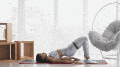 매트에 누운 상태에서 다리 사이에 밴드를 착용합니다. 무릎을 당겨서 세우고, 발은 바닥에 붙이세요. 엉덩이를 들면서 브릿지 자세를 만듭니다. 이때 다리를 벌렸다가 오므리는 동작을 추가하세요. 업다운 동작을 반복합니다. 1분간 진행하세요.
