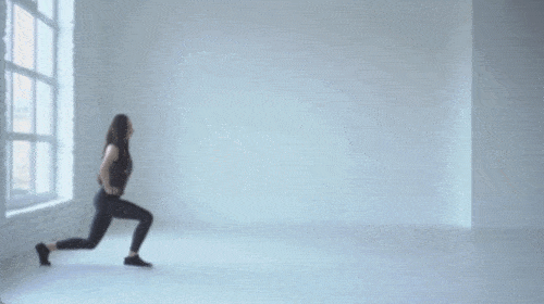 발을 모으고 바닥에 서서 손은 옆구리로 가져갑니다. 오른발을 앞으로 뻗으면서 런지 동작을 진행하세요. 왼발을 앞으로 당기면서 뻗고, 무릎을 구부리면서 런지 동작으로 연결합니다. 앞으로 움직이면서 1분 동안 운동하세요.