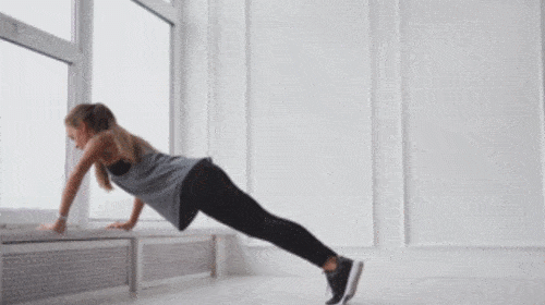 경사를 활용하여 팔굽혀펴기를 진행하세요. 손을 짚고 자세를 준비합니다. 팔꿈치를 구부리면서 몸 전체를 바닥으로 내리세요. 팔꿈치를 펴면서 몸 전체를 올려줍니다. 1분 동안 팔굽혀펴기 동작을 반복하세요. 시선은 바닥을 응시합니다.